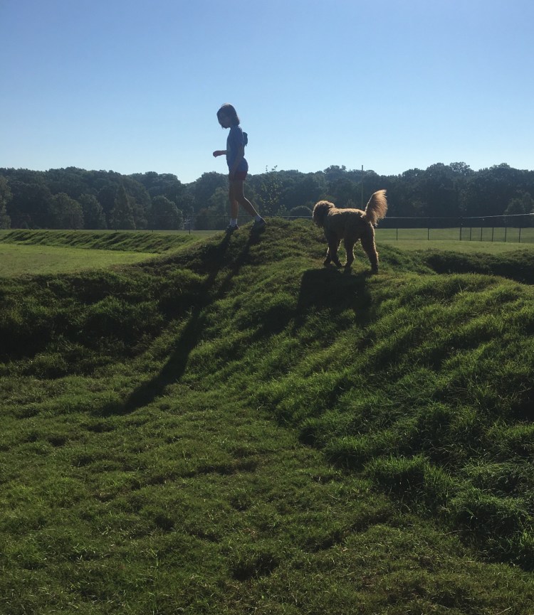 Don’t get me wrong, Lucy has played with other dogs before. But, it is usually the ‘I chase you for a minute’, and then later, you chase me. Today, she chose to play with this other dog, and simultaneously, the other dog, chose to play with Lucy. They were doing the full-out, front paws splayed, little-barky thing, that signals game on. They played together, for about five minutes, running on, over, and around, the little man-made hills…and then it happened.