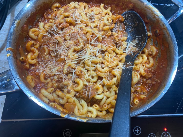 - After the meat mixture has simmered, add the pasta to the meat mixture. Taste test to decide if added salt is needed. Top with Parmesan Cheese. Serve hot.